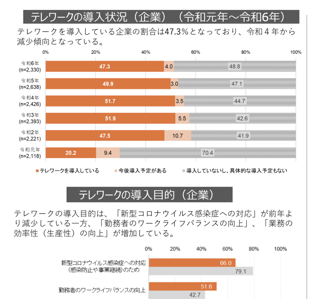 しかし一方で、テレワークの導入目的を「勤務者のワークライフバランスの向上」「育児・介護中の社員への対応」と回答した企業の割合は増加傾向にあります。
