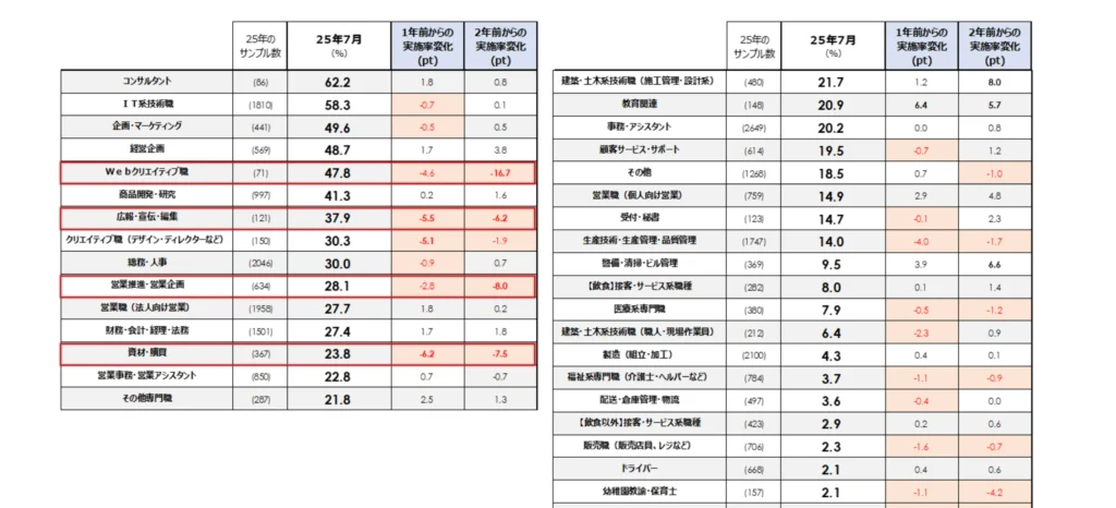 たとえば、次のような職種では在宅勤務の割合が高くなっています。