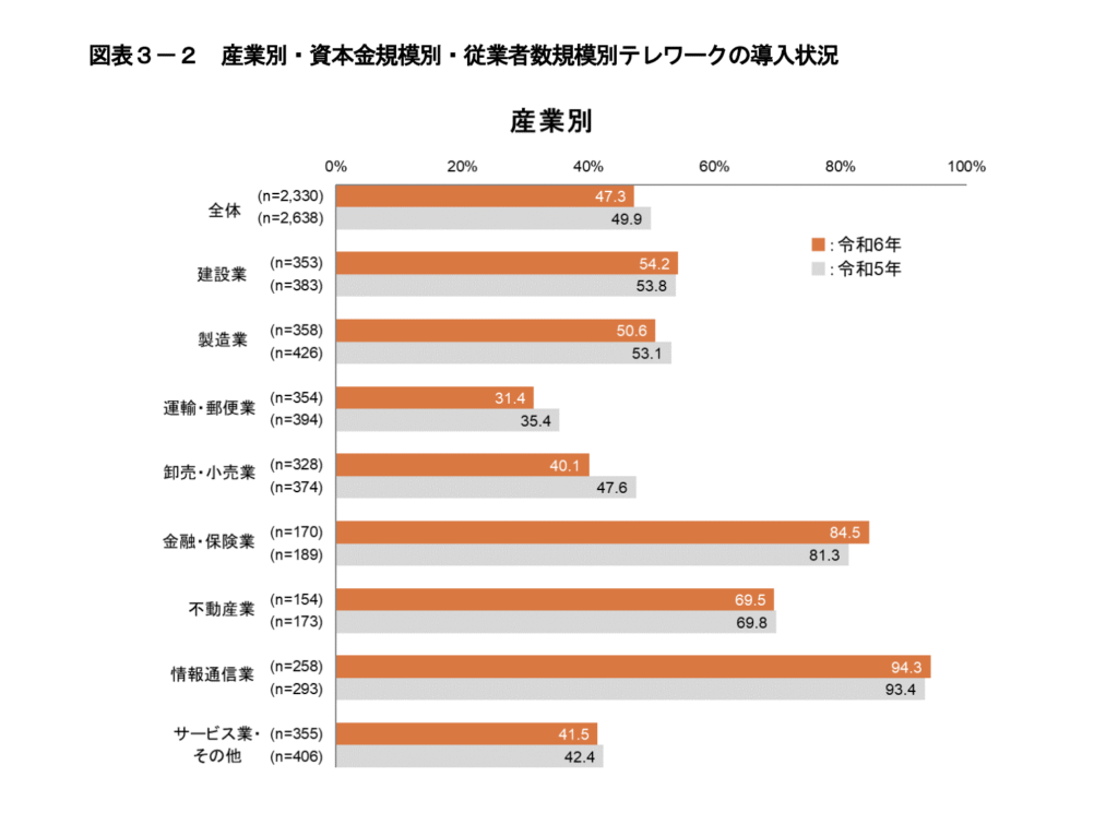 このデータからは、情報通信や金融・保険業では在宅勤務がしっかり定着していることがわかります。