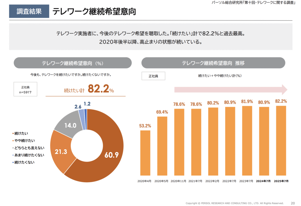 パーソル研究所「第十回・テレワークに関する調査」によると、テレワーク実施者のうち、82.2%の人が「テレワークを継続したい」と答えたそうです。