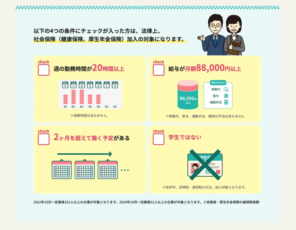 会社員は一定以上の条件で社会保険に加入することができます。次の画像の4つの条件にチェックが入る人は、会社の社会保険に入ることになります。